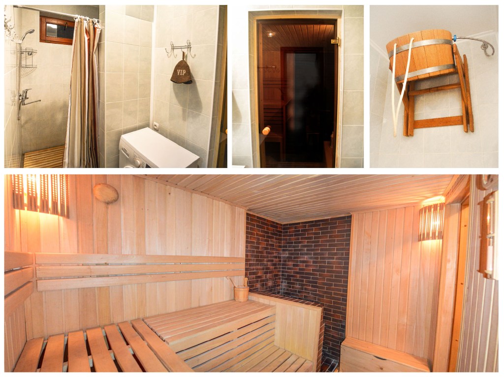 Сучасна сауна з котлом на дровах розрахована для компанії з кількох осіб, обладнана термометром, гігрометром, відром для вологої бані, біля входу розміщено душ з дубовим відром для контрастних обливань холодною водою
