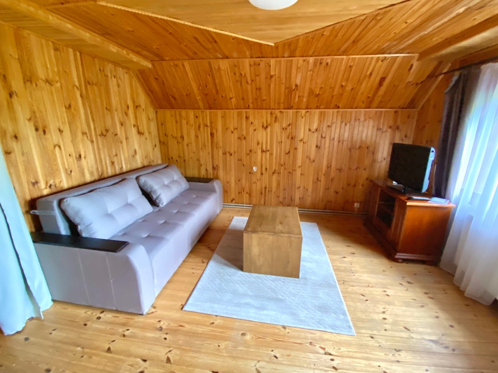 Прохід до вищезазначеної спальні веде через вітальню другого поверху, що в лівій частині будинку, з виходом на балкон, тут розміщено розкладний двоспальний диван, телевізор